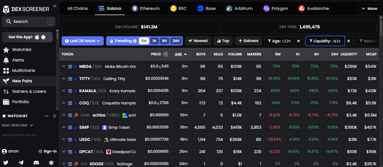 Для поиска монет я использую платформу Dexscreener, потому что она, как по мне, очень удобна и практична, а самое главное, что здесь наименьшая вероятность попадания на скам или раг (rugpull - потеря ликвидности). Здесь необходимо настроить фильтры, лично я использую "Last 5 minutes", "Trending 5m".
