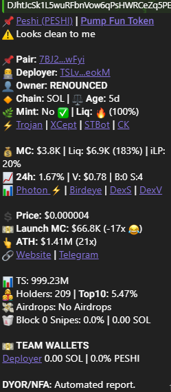 Прежде чем приступить к торговле, необходимо повторно проверить щиток на скам (мошенничество), TTFBot справится с этой задачей лучше всего. Отправляем ему CA (Contract address, идентификатор щитка) и он выдает всю информацию о монете. Если сожжена ликвидность, есть отказ от владения и отменена заморозка, это уже +70% к успеху. Так выглядит чистый щиток: